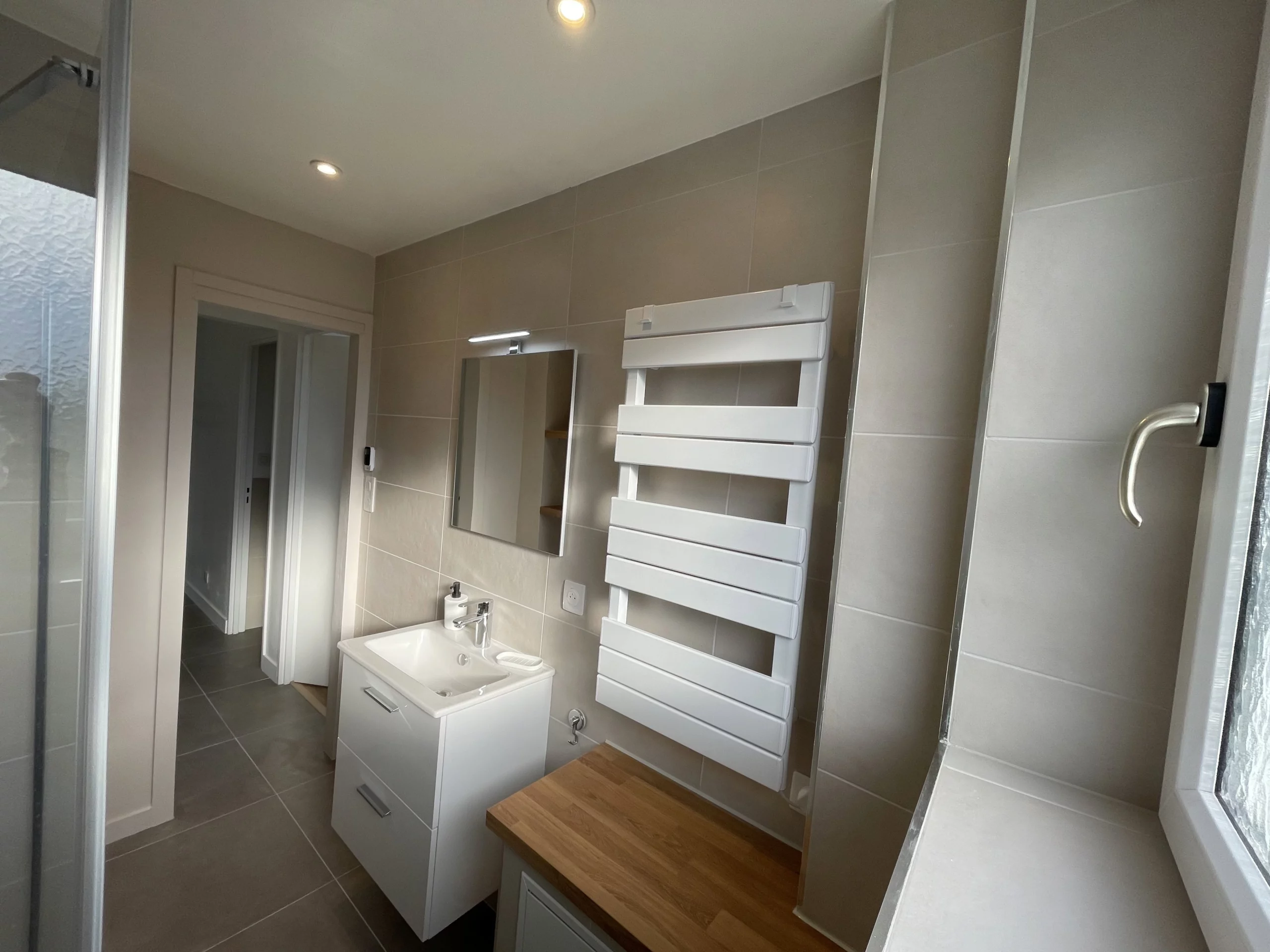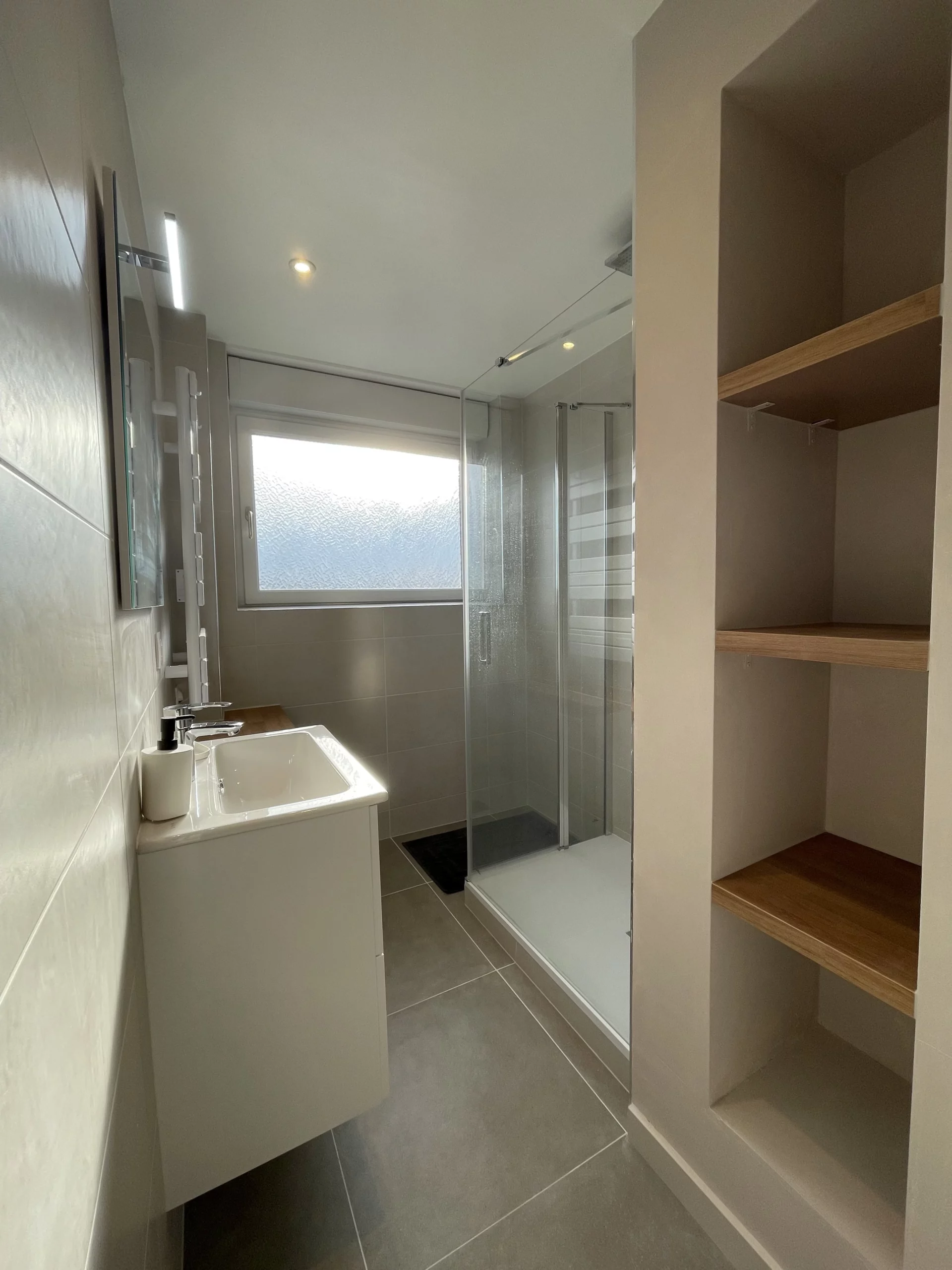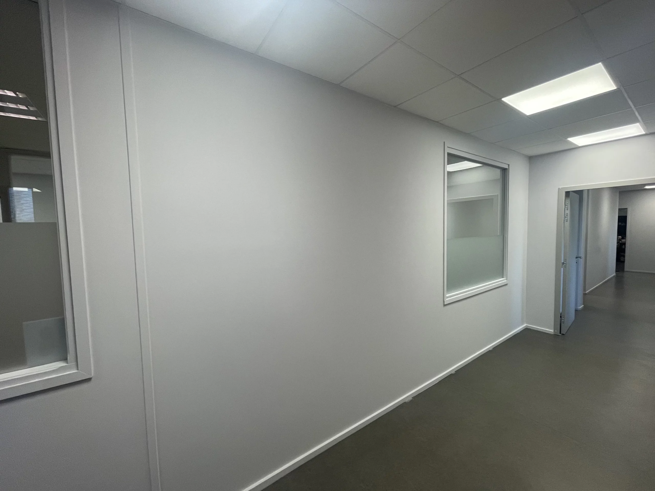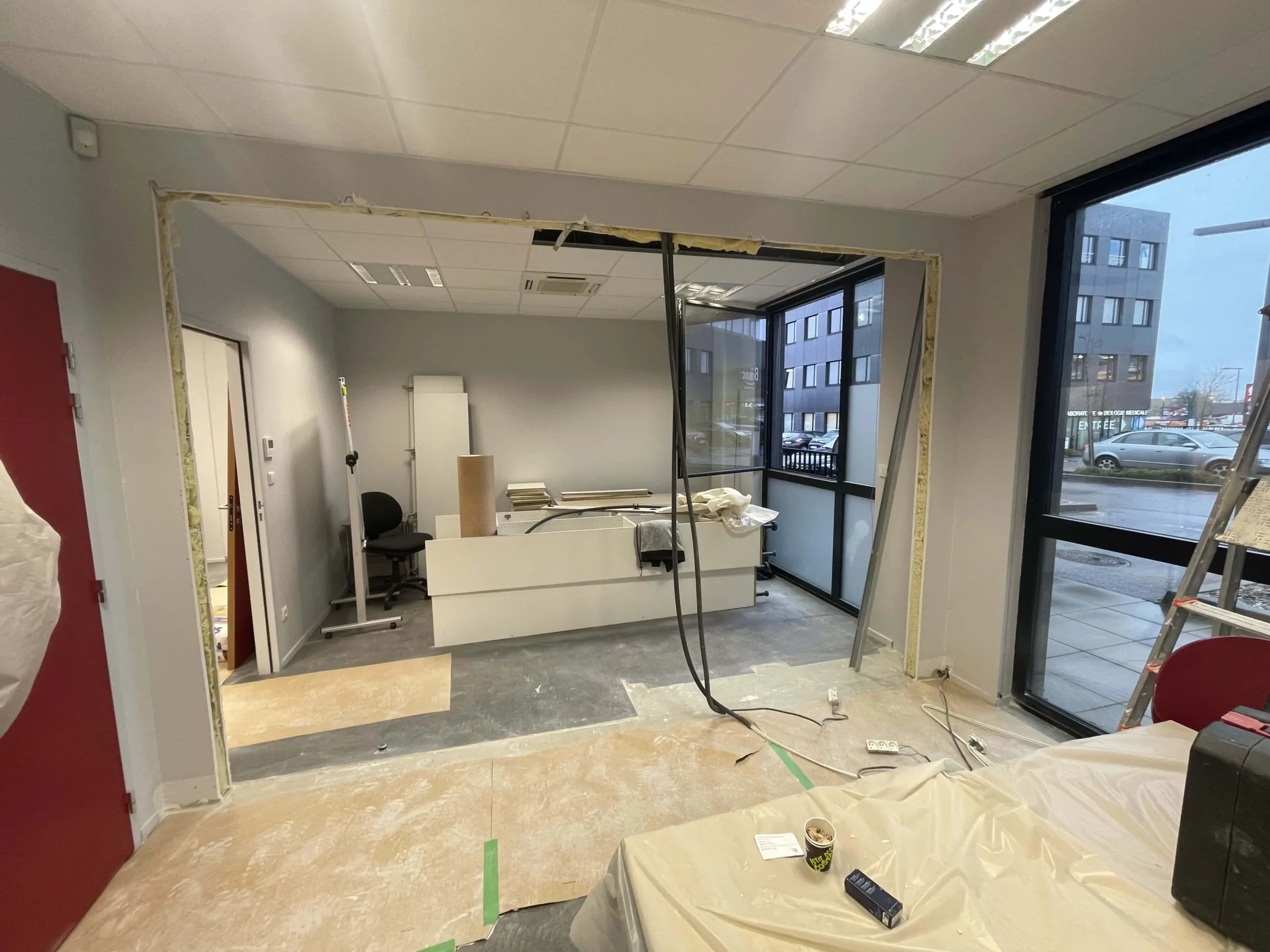 Transformation complète des espaces avec ouverture partielle du mur au rez-de-chaussée et reprise des ébrasements, ainsi que la création à l’étage d’une cloison toute hauteur avec nouvel accès, accompagnée des finitions complètes : ratissage, peinture et pose des plinthes.
